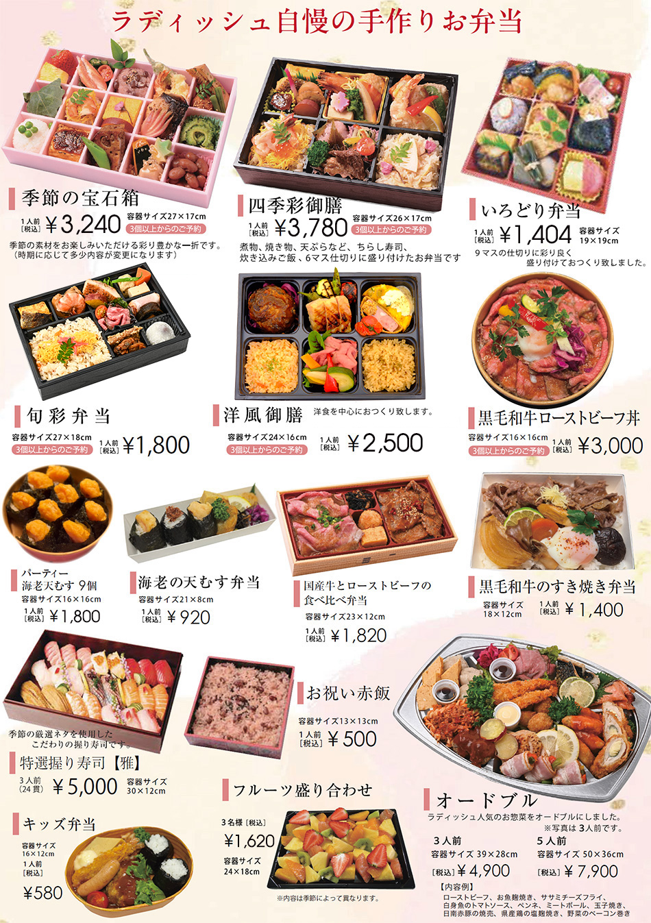 学校行事、お誕生日などのご家族の祝い事や記念日、お仲間の集い、オフィスの宴会、ビジネスランチ、式典、法要など様々なシーンにラディッシュ自慢の手作りオードブルをどうぞ。