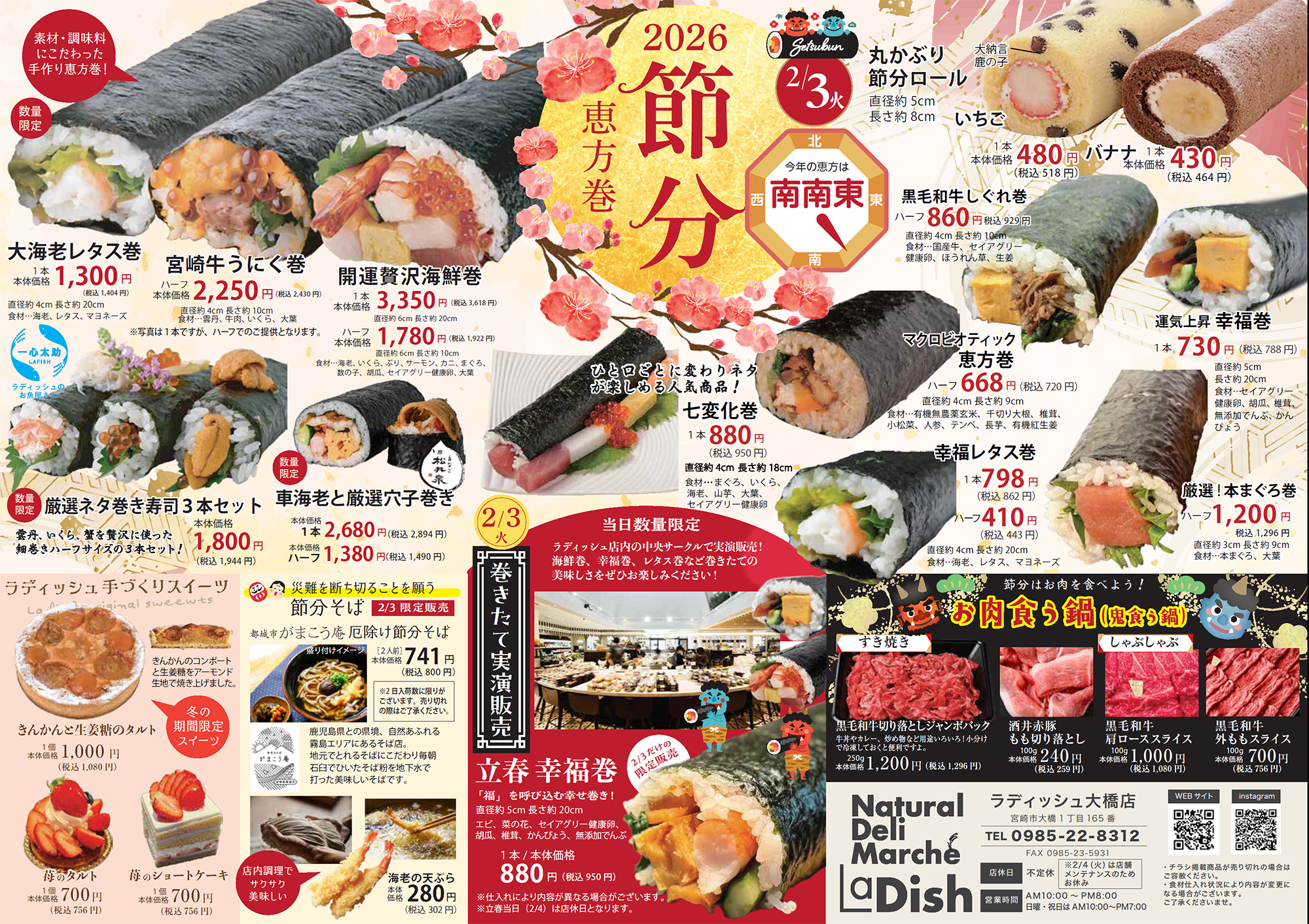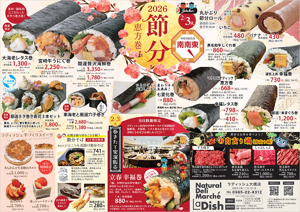 2/3(火)はラディッシュ節分フェア! ラディッシュではオリジナルの厳選恵方巻が勢揃い。巻きたて実演販売もあります。 その他、厄除け節分そばや、手作りスイーツなど多数取り揃えております。 恵方の方角、南南東に向かって恵方巻をほうばって、今年の福を願いましょう。