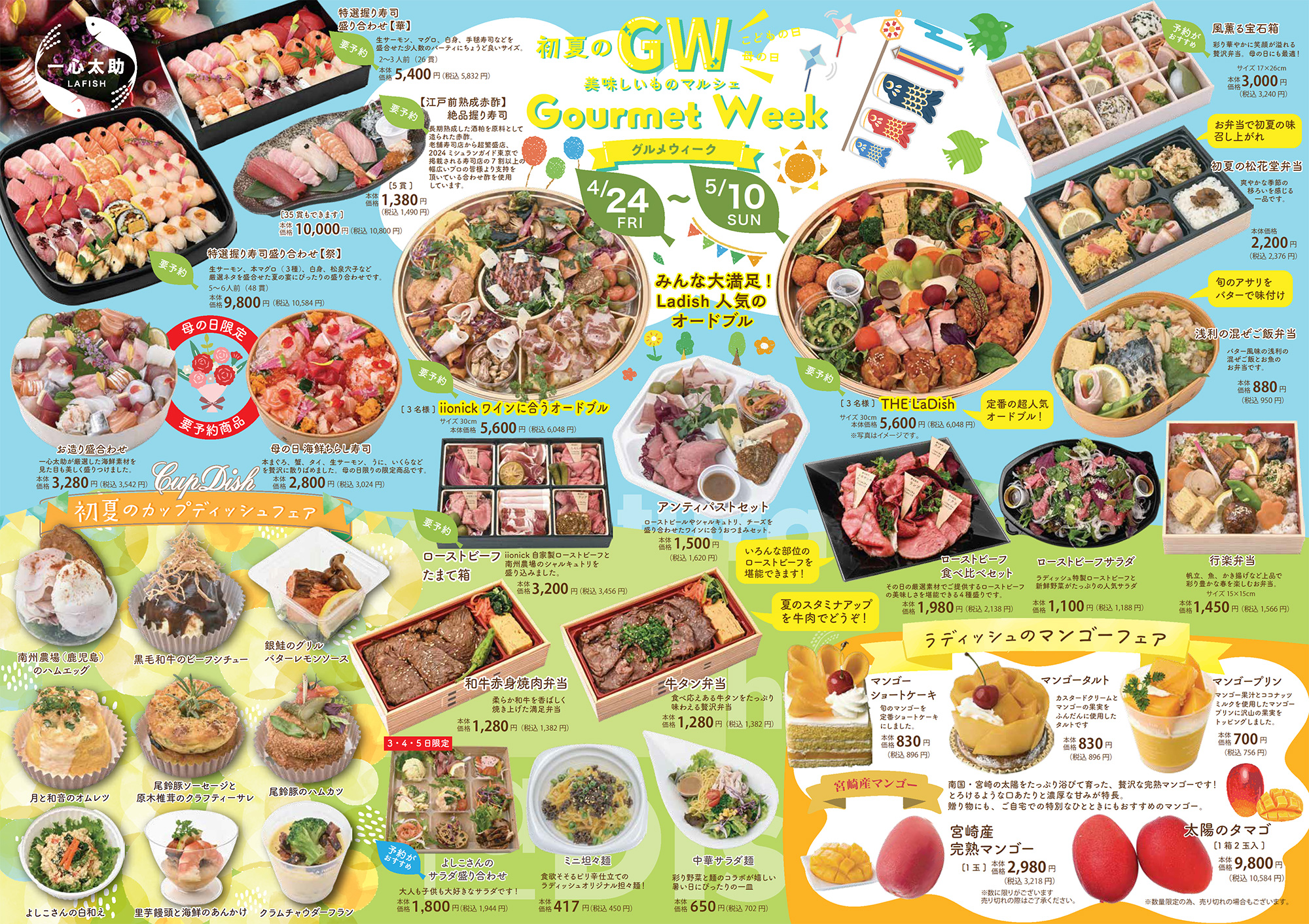 こどもの日のお祝いにぴったりなオードブルや、母の日限定海鮮ちらし寿司、マンゴーを使ったスイーツ、旬の野菜・海産物を使用したお惣菜など多数ご用意いたしました。