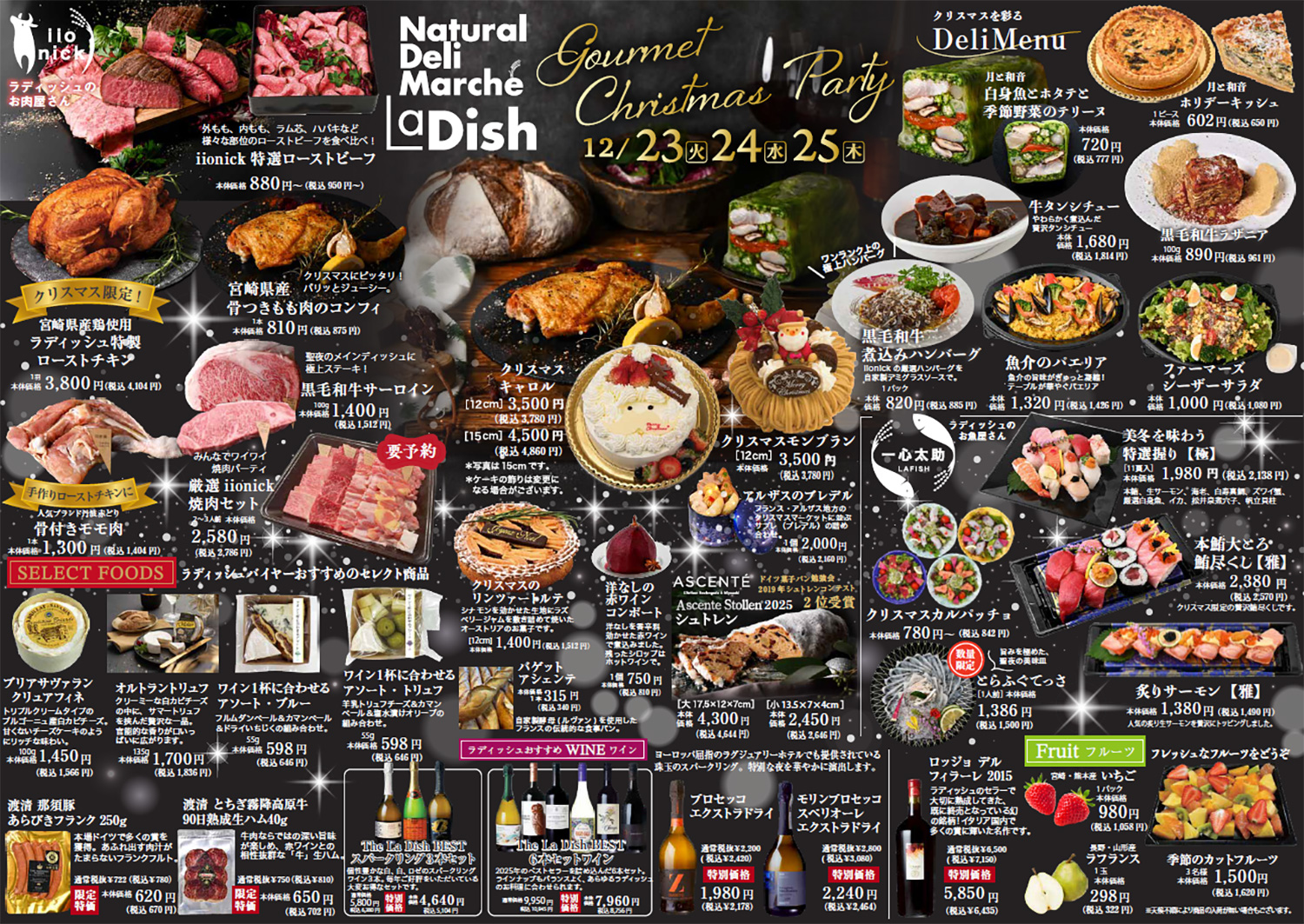 日頃よりご愛顧いただきありがとうございます。 12/23(火)~12/25(木)クリスマスフェアを開催いたします。 ローストチキンや焼き肉用のお肉、カルパッチョやお寿司・特製テリーヌやキッシュなどのお惣菜、ラディッシュセレクトのワインとぴったりなチーズなど、クリスマスを豪華に彩るメニューを多数ご用意しております。 ご家族・ご友人との楽しいひと時に是非ご利用ください。 ■12/19(金)~12/22(月)開催・美味鍋フェアはこちら>>